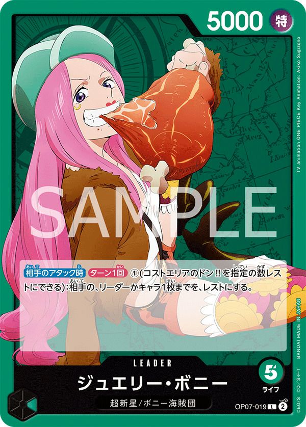 ジュエリー・ボニー(OP07-019)は、ワンピースカードゲーム「500年後の未来」ブースターパックに収録された緑属性のリーダーカードです。コスト5、パワー5000を持ち、特徴は「超新星」と「ボニー海賊団」です。相手のアタック時に、コストエリアのドン!!を1枚レストすることで、相手のリーダーかキャラ1枚をレスト状態にする効果を持ちます。 この効果により、相手の攻撃を制限し、戦況を有利に進めることが可能です。