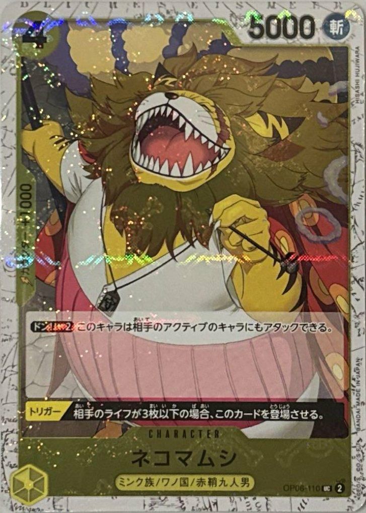 「ネコマムシ(海賊旗フォイル)(OP06-110)[UC]」は、ワノ国編で活躍するキャラクターのカードです。ユニークなデザインの海賊旗フォイルバージョンが特徴で、光沢感と細部の表現が際立っています。デッキにおいては、ミンク族キャラクターやワノ国テーマのデッキにぴったりで、効果的に活躍できるカードです。