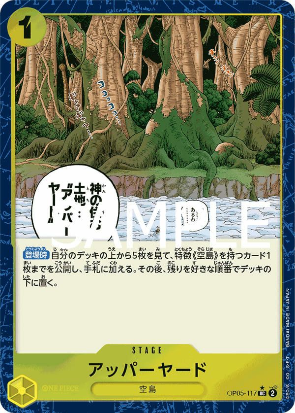 「アッパーヤード(OP05-117)[UC-P](フルアートパラレル)」は、黄色属性のステージカードで、空島テーマのデッキに役立つ効果を持ちます。登場時にデッキの上から5枚を確認し、空島特徴のカードを手札に加えることができるため、戦略的に使用されます。フルアートパラレル仕様で、美しいイラストが魅力的な一枚です。