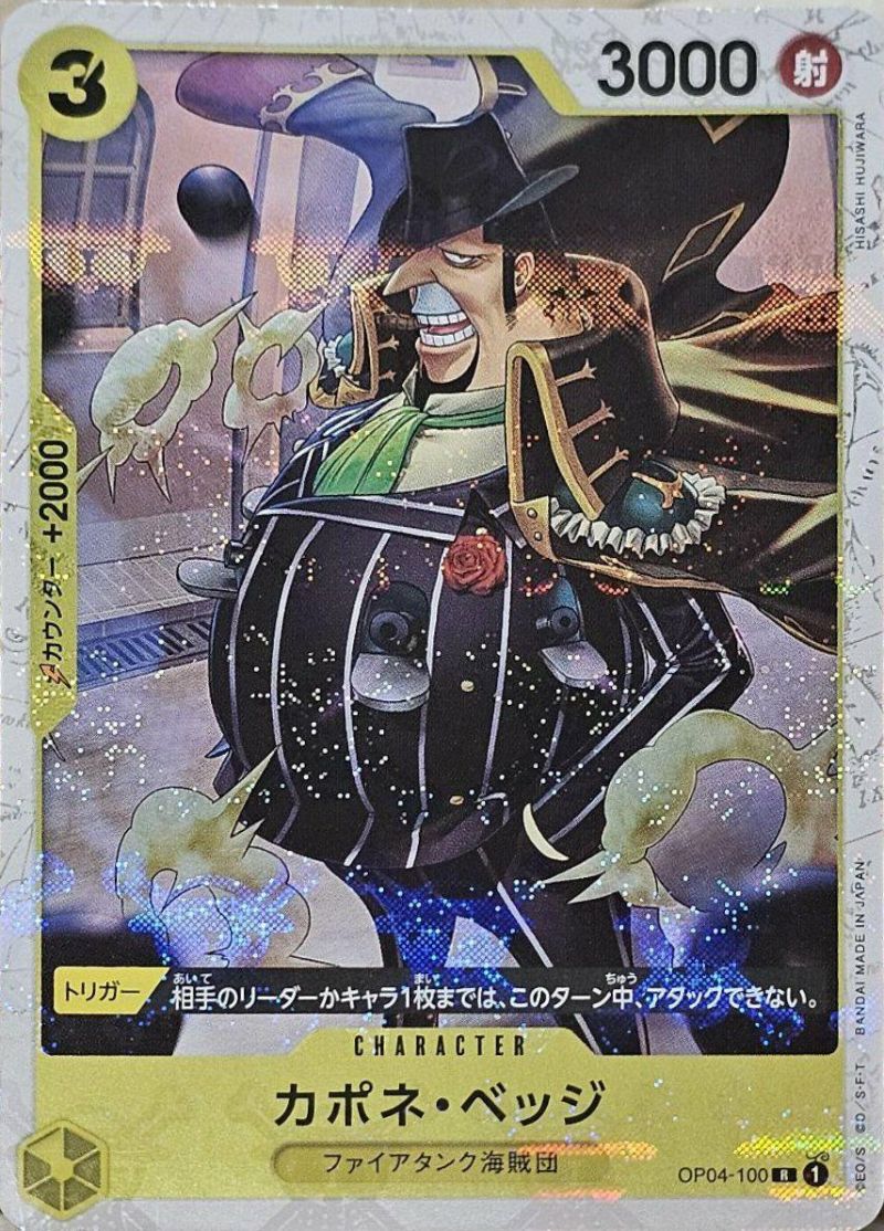 「カポネ・ベッジ」(OP04-100)は、黄属性のキャラクターカードで、コスト3、パワー3000を持ち、「ファイアタンク海賊団」の特徴を有しています。トリガー効果として、相手のリーダーかキャラ1枚をこのターン中アタックできなくする能力を持ち、相手の攻撃を一時的に封じることが可能です。海賊旗フォイル仕様のカードは、通常版とは異なる特別な加工が施されており、コレクターやファンにとって魅力的な一枚となっています。