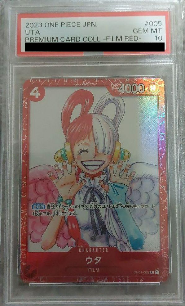 「ウタ(OP01-005)」は、赤属性のキャラクターカードでコスト4、パワー4000を持つ。登場時効果で、自分のトラッシュから「ウタ」以外のコスト3以下の赤キャラ1枚を手札に加える。映画『ONE PIECE FILM RED』関連のプロモーションカードで、デッキ内での補充役として活躍する。パラレル版は特別なイラストが特徴。
