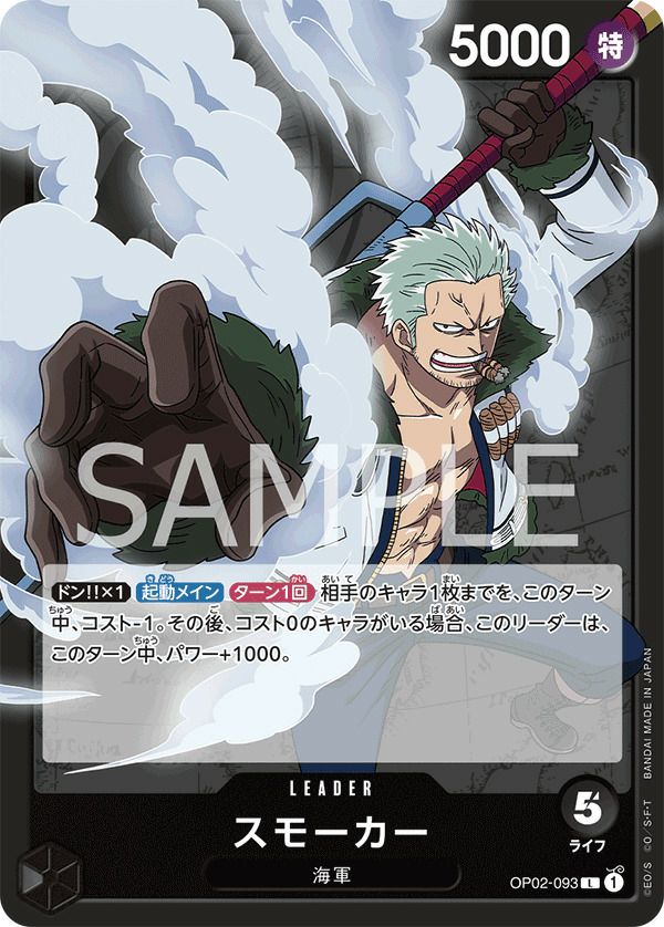 スモーカー(OP02-093)は、ワンピースカードゲーム「頂上決戦」ブースターパックに収録された黒属性のリーダーカードです。起動メイン効果として、ドン!!カードを1枚消費することで、相手のキャラクター1体のコストをターン中に1減少させます。さらに、相手の場にコスト0のキャラクターが存在する場合、このリーダーのパワーがターン中に1000増加します。この能力により、相手のキャラクターを弱体化させつつ、自身の攻撃力を強化する戦略が可能です。