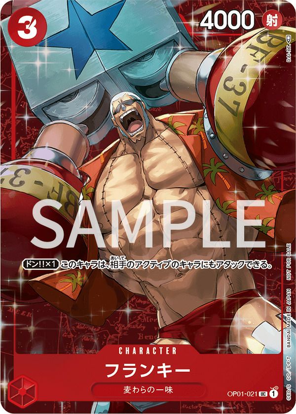 フランキー(スタンダードバトル 9月優勝記念品)(OP01-021)[UC-P]は、赤色のキャラクターカードで、コスト3、パワー4000のステータスを持ちます。特に注目すべき能力は、【ドン_×1】によって、相手のアクティブなキャラにもアタックできる点です。この能力を活かして、相手の防御を突破する役割を果たします。特徴は「麦わらの一味」で、デッキ内では攻撃力の高いキャラクターとして活躍します。