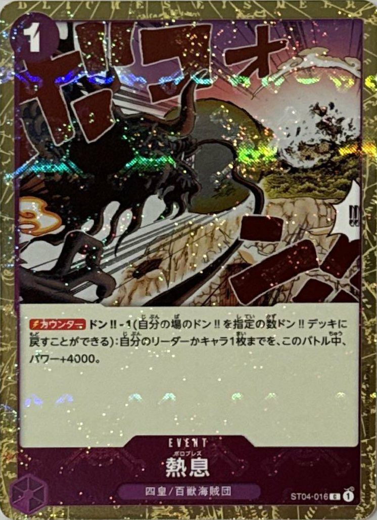 「熱息(海賊旗フォイル)(ST04-016)[C]」は、紫のイベントカードで、コスト1で使用可能です。効果は「カウンター」で、ドン!!-1を使い、自分のリーダーやキャラクター1枚をパワー+4000することができます。これにより、相手の攻撃を防ぐとともに、戦闘時のアドバンテージを得ることができます。海賊旗フォイル版は、通常のカードよりも印刷や質感に特徴があり、コレクターにとって魅力的です。