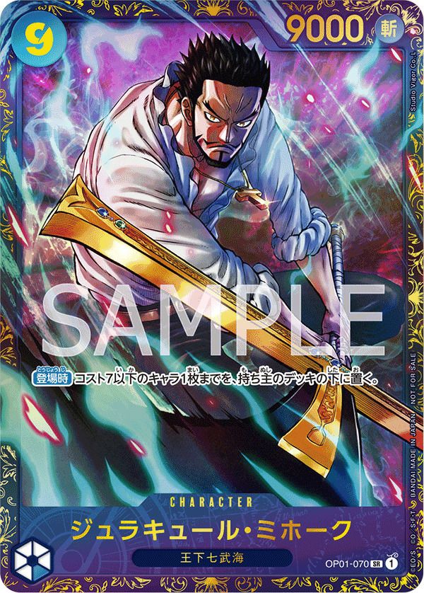 「ジュラキュール・ミホーク(フラッグシップバトル2024 1月優勝記念品)(OP01-070)[SR]」は、青属性の強力なキャラクターカードです。コスト9でパワー9000を誇り、登場時には相手のコスト7以下のキャラ1枚をデッキの下に送る能力を持ち、相手の動きを封じることができます。特徴は「王下七武海」で、デッキでの役割は相手キャラクターの妨害や盤面制圧に優れています。特典カードとして登場するパラレル版は、さらに魅力的なデザインが特徴です。