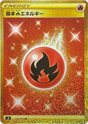 基本炎エネルギー(129/100)[UR]は、拡張パック「フュージョンアーツ」に収録されたウルトラレア仕様の基本エネルギーカードです。このカードは、炎タイプのポケモンにエネルギーを供給する際に使用されます。UR(ウルトラレア)仕様のカードは、豪華なホイル加工が施されており、特にコレクターから高い人気を集めています。デッキ構築においては、炎タイプのポケモンを中心としたデッキで使用されることが多いです。