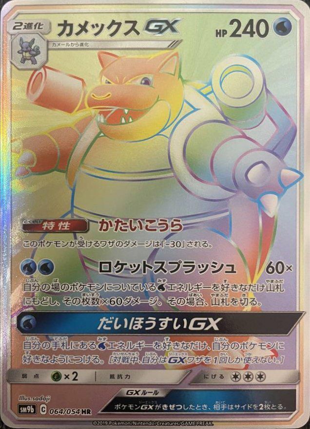 カメックスGX(064/054)[HR]は、HP240の水タイプの2進化ポケモンGXです。特性「かたいこうら」により、このポケモンが受けるワザのダメージは「-30」され、耐久性が向上します。ワザ「ロケットスプラッシュ」は、自分の場のポケモンについている水エネルギーを好きなだけ山札に戻し、その枚数×60ダメージを与えます。GXワザ「だいほうすいGX」は、自分の手札にある水エネルギーを好きなだけ、自分のポケモンに好きなように付けることができます。これらの能力により、エネルギー管理と高火力攻撃が可能です。デッキでは、エネルギーの再利用と強力な一撃を狙う戦術に適しています。また、HR(ハイパーレア)仕様のこのカードは、特別な光沢とデザインが施され、コレクターズアイテムとしても人気があります。