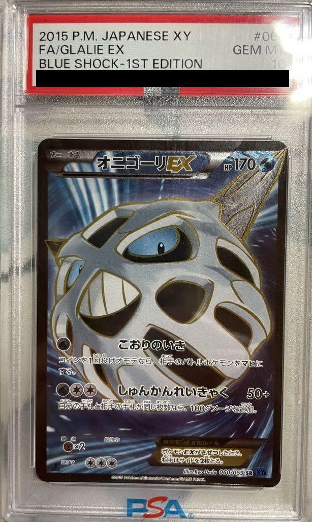 オニゴーリEX(060/059)[SR]は、HP170の水タイプのたねポケモンEXです。ワザ「こおりのいき」はコインを1回投げ、表なら相手のバトルポケモンをマヒにします。「しゅんかんれいきゃく」は50ダメージを与え、自分と相手の手札が同じ枚数なら、追加で100ダメージを与えます。デッキでは、相手の行動を制限しつつ、高火力を狙えるアタッカーとして活躍します。SR(スーパーレア)版は、特別なホログラム加工が施され、コレクション性が高いのが特徴です。このカードは、拡張パック「青い衝撃」に収録されています。