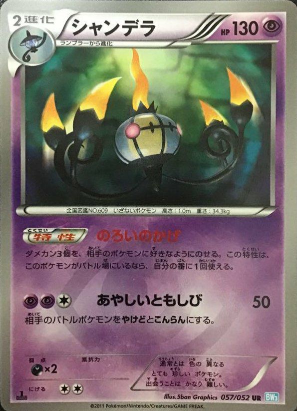 シャンデラ(057/052)は、拡張パック「ヘイルブリザード」に収録されたウルトラレア(UR)の超タイプ2進化ポケモンで、HPは130です。特性「のろいのかげ」は、バトル場にいるときに1回使え、相手のポケモンにダメカンを3個好きなようにのせることができます。技「あやしいともしび」は超エネルギー2個と無色エネルギー1個で50ダメージを与え、相手のバトルポケモンをやけどとこんらん状態にします。デッキ構築では、特性によるダメカン操作と状態異常を組み合わせ、相手の戦略を妨害する戦術が有効です。