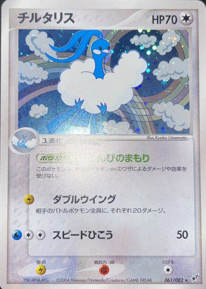 「蒼空の激突」は、2004年7月1日に発売されたポケモンカードゲームPCGシリーズの第2弾拡張パックです。このセットでは、伝説のポケモン「レックウザ」や「デオキシス」が中心となり、特に「デオキシス」は異なるフォルムで複数のカードとして登場しました。また、新たなレアリティとして「ポケモン☆(スター)」が初登場し、デッキに1枚しか入れられない特別なカードとして注目を集めました。さらに、「ルンパッパ」や「マグカルゴ」など、公式大会で活躍したカードも多数収録されており、デッキ構築の幅を広げる内容となっています。