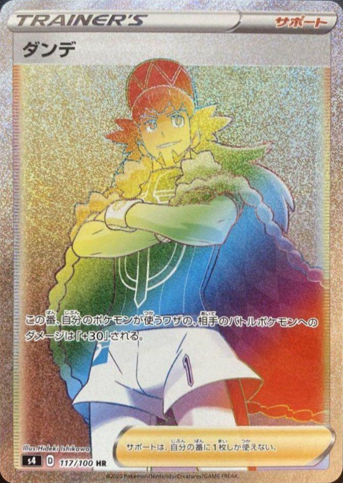 「ダンデ」(117/100)は、拡張パック「仰天のボルテッカー」に収録されたハイパーレア(HR)のサポートカードです。このカードを使用すると、その番に自分のポケモンが使うワザの、相手のバトルポケモンへのダメージを30増加させることができます。特に、同パック収録の「リザードン」と組み合わせることで、リザードンのワザ「キングブレイズ」のダメージを大幅に引き上げ、強力な攻撃が可能となります。HR版のイラストは、キラ加工が施され、豪華なデザインが特徴です。