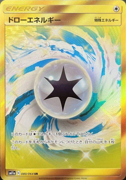 ドローエネルギー(080/064)は、強化拡張パック「リミックスバウト」に収録された特殊エネルギーカードのウルトラレア(UR)版です。このカードは無色エネルギー1個分として機能し、手札からポケモンに付けたときに自分の山札を1枚引くことができます。これにより、エネルギー供給とドローを同時に行うことが可能です。イラストはToyste Beach氏が手掛けています。