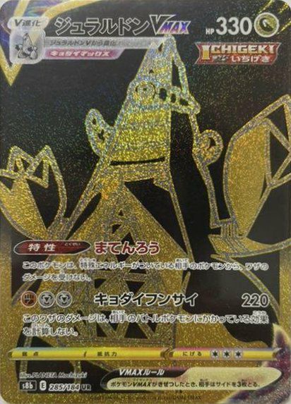 ジュラルドンVMAX(285/184)は、ハイクラスパック「VMAXクライマックス」に収録されたウルトラレア(UR)のドラゴンタイプのポケモンVMAXで、HPは330です。特性「まてんろう」により、特殊エネルギーがついている相手のポケモンからワザのダメージを受けません。技「キョダイフンサイ」は、闘エネルギー1個と鋼エネルギー2個で220ダメージを与え、このワザのダメージは相手のバトルポケモンにかかっている効果を計算しません。デッキ構築では、特性を活かして特殊エネルギーを多用するデッキに対して有利に戦えます。また、技の効果により、相手のバトルポケモンの防御効果を無視して大ダメージを与えることが可能です。ただし、ポケモンVMAXがきぜつしたとき、相手はサイドを3枚とるため、運用には注意が必要です。このUR版のイラストは、通常版とは異なる豪華なデザインが特徴で、コレクターから高い人気を誇ります。