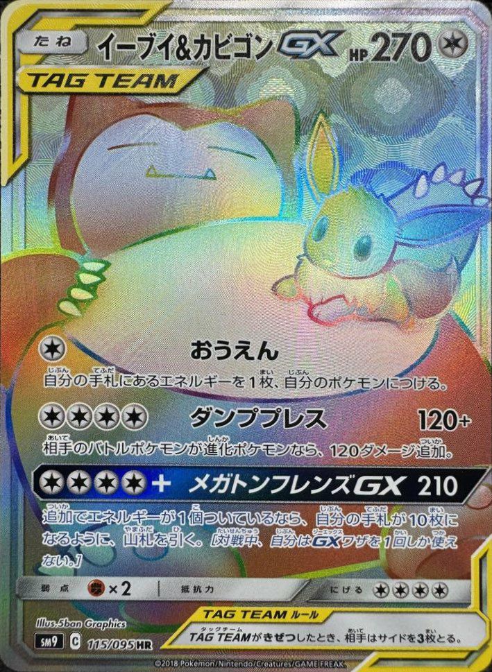 イーブイ&カビゴンGX(115/095)は、拡張パック「タッグボルト」に収録された無色タイプのたねポケモンGXで、ハイパーレア(HR)仕様のカードです。このカードは、イーブイとカビゴンが共演する特別なイラストが特徴で、コレクターから高い評価を受けています。また、強力なワザと高いHPを持ち、デッキの主力として活躍が期待できます。