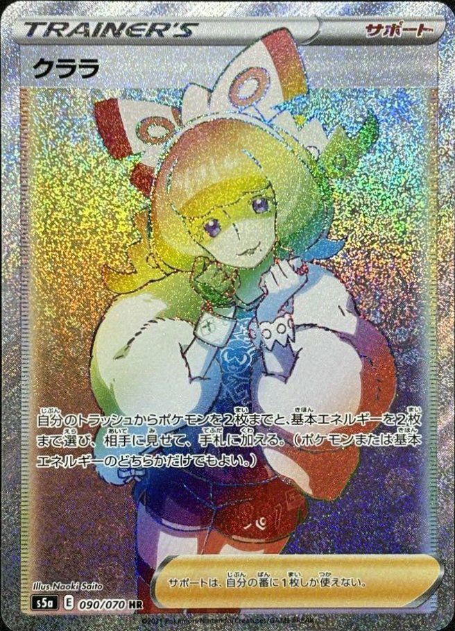 クララ(090/070)[HR]は、トラッシュからポケモン2枚と基本エネルギー2枚を手札に加えるサポートカードです。デッキのリソース回復に優れ、特に中盤以降の展開で重宝します。ハイパーレア(HR)版は、虹色の光沢加工が施され、コレクション性が高い一枚です。