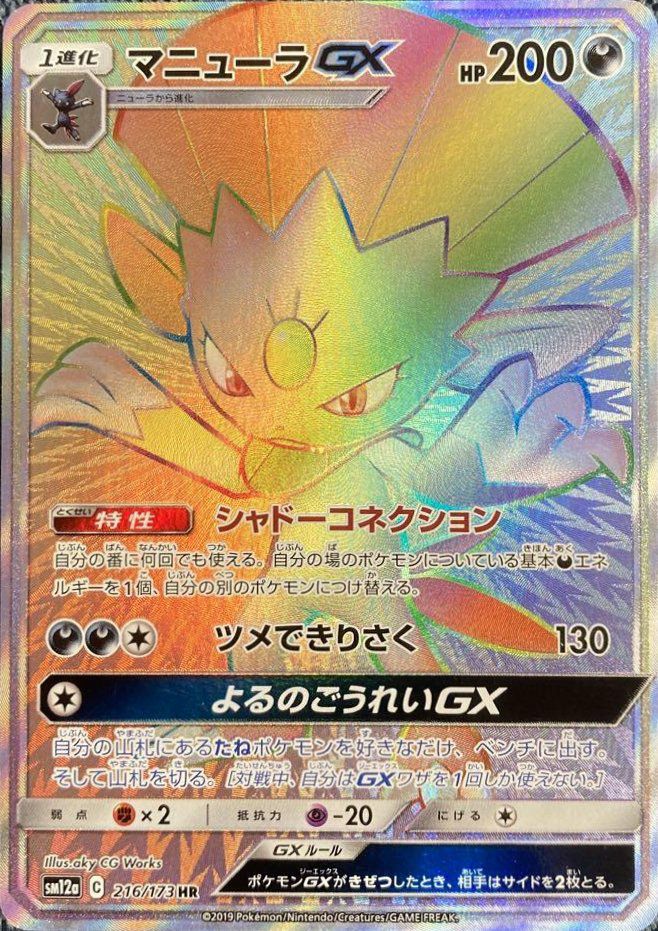マニューラGX(216/173)は、悪タイプの1進化ポケモンで、HPは200です。特性「シャドーコネクション」により、自分の番に何度でも、自分の場のポケモンについている基本悪エネルギーを他のポケモンに付け替えることができます。ワザ「ツメできりさく」は、悪エネルギー2個と無色エネルギー1個で130ダメージを与えます。GXワザ「よるのごうれいGX」は、無色エネルギー1個で自分の山札から好きなたねポケモンをベンチに好きなだけ出すことができます(対戦中、GXワザは1回しか使えません)。このカードは、ハイクラスパック「TAG TEAM GX タッグオールスターズ」に収録されています。HR(ハイパーレア)版は、特別なホログラフィック加工が施された豪華なデザインが特徴です。