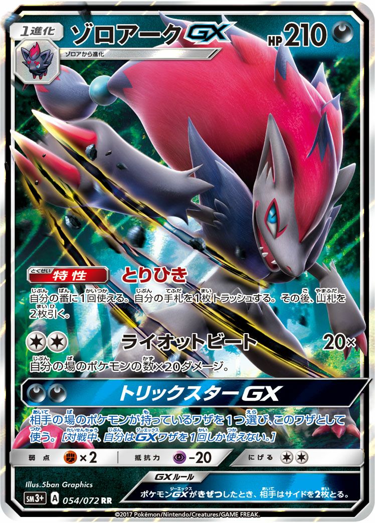 ゾロアークGX(054/072)は、悪タイプの1進化ポケモンGXで、HPは210です。特性「とりひき」は、手札を1枚トラッシュして山札から2枚引く効果があり、手札の循環を促進します。ワザ「ライオットビート」は、自分の場のポケモンの数×20ダメージを与え、最大で120ダメージを狙えます。GXワザ「トリックスターGX」は、相手の場のポケモンが持つワザを1つ選んで使用でき、戦況に応じた柔軟な戦術が可能です。デッキ構築において、手札補充と高火力を両立する優れたカードとして活躍します。