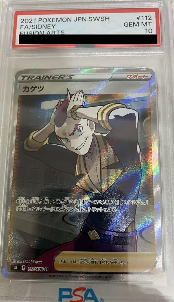 カゲツ(112/100)は、拡張パック「フュージョンアーツ」に収録されたサポートカードのスーパーレア(SR)版です。このカードを使用すると、相手の手札を確認し、その中から「ポケモンのどうぐ」「スタジアム」「特殊エネルギー」を2枚まで選んでトラッシュできます。この効果により、相手の戦略を妨害しつつ、自分の有利な状況を作り出すことが可能です。イラストは石川ヒデキ氏が手掛けています。