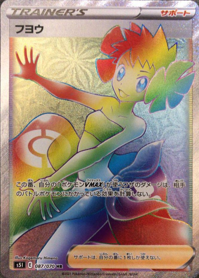 フヨウ(087/070)[HR]は、拡張パック「一撃マスター」に収録されたサポートカードで、ハイレアリティのHR(ハイパーレア)仕様です。このカードを使用すると、その番に自分の「ポケモンVMAX」が使うワザのダメージは、相手のバトルポケモンにかかっている効果を無視して計算されます。これにより、相手の防御効果を突破し、大きなダメージを与えることが可能です。HR仕様のカードは、光沢のある特別なデザインが施されており、コレクション性も高いです。