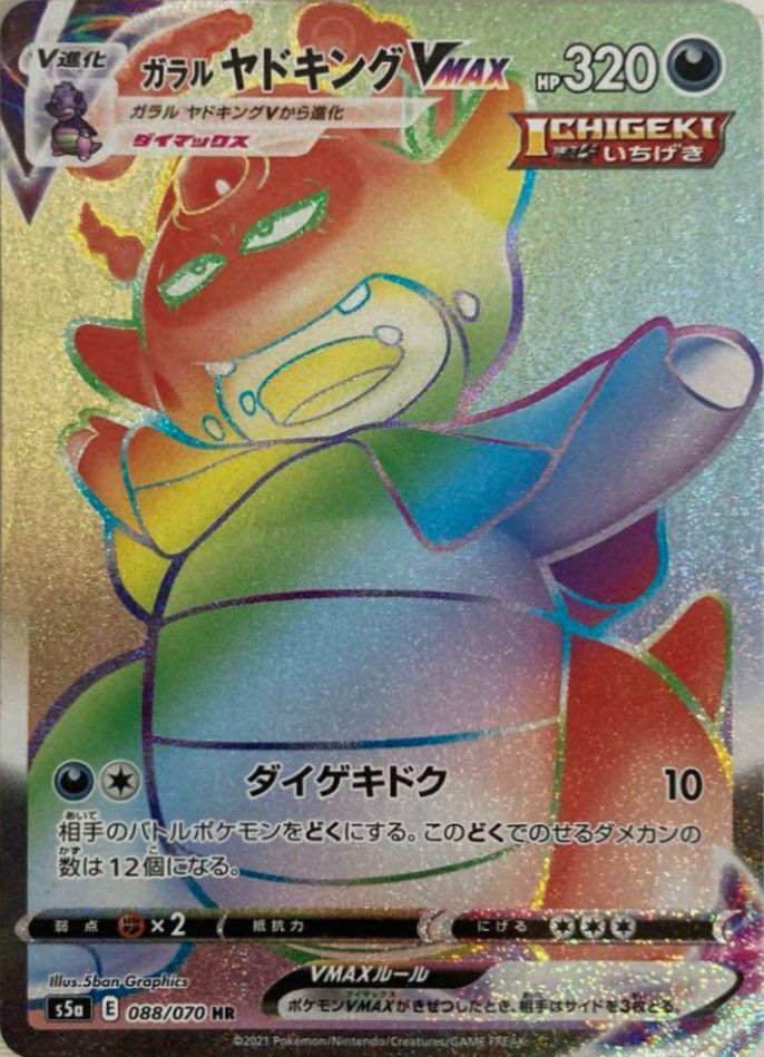ガラルヤドキングVMAX(088/070)は、HP320の悪タイプのポケモンVMAXで、ワザ「ダイゲキドク」により、相手のバトルポケモンをどく状態にし、このどくでポケモンチェックごとにダメカンを12個乗せます。HR(ハイパーレア)版は、虹色の光沢を持つ特別なイラストが特徴で、コレクション性が高いです。