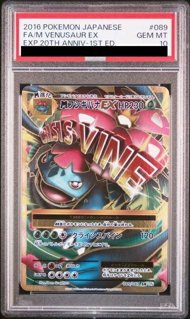 MフシギバナEX(089/087)は、HP230の草タイプM進化ポケモンで、ワザ「クライシスバイン」により120ダメージを与え、相手のバトルポケモンをどくとマヒにします。この効果により、相手の行動を制限しつつ持続的なダメージを与えることが可能です。SR(スーパーレア)仕様のカードで、美麗なイラストと加工が施され、コレクション性も高い一枚です。