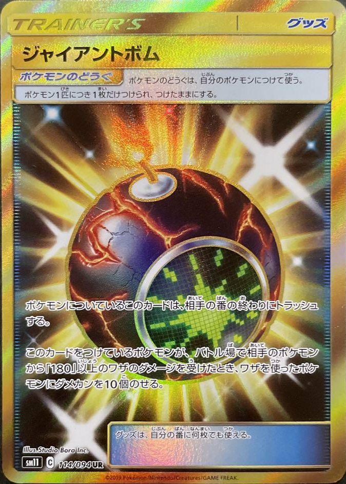 ジャイアントボム(114/094)は、拡張パック「ミラクルツイン」に収録されたウルトラレア(UR)のポケモンのどうぐカードです。このカードをポケモンにつけると、相手の番の終わりにトラッシュされますが、つけているポケモンがバトル場で相手のポケモンから180以上のワザのダメージを受けたとき、ワザを使ったポケモンにダメカンを10個のせることができます。デッキでは、高火力の攻撃を仕掛けてくる相手に対する牽制として活用されます。イラストはStudio Bora Inc.が担当しています。