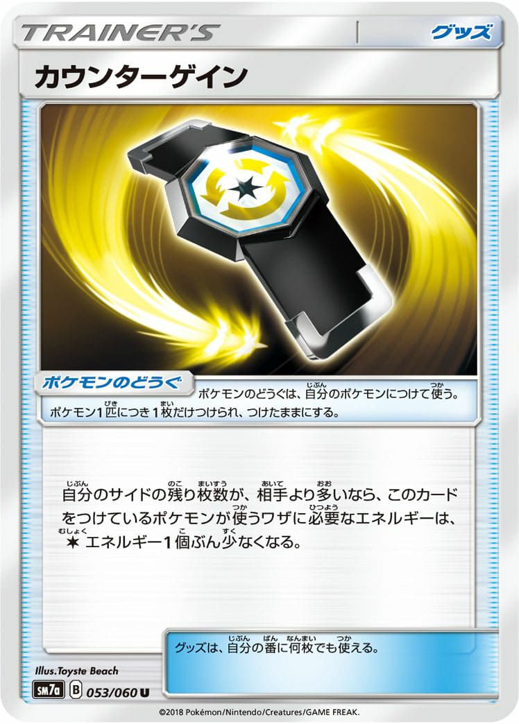 カウンターゲイン(073/060)は、強化拡張パック「迅雷スパーク」に収録されたグッズカードです。このカードをポケモンに付けると、自分のサイドの残り枚数が相手より多い場合、そのポケモンが使うワザに必要なエネルギーが無色エネルギー1個分少なくなります。デッキでは、劣勢時のエネルギーコスト軽減手段として活用されます。UR(ウルトラレア)版のカードは、特別なホログラフィック加工が施され、美麗なデザインが特徴です。