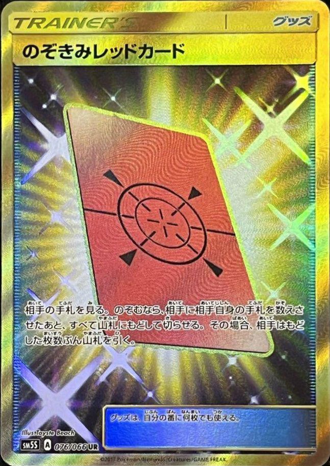 のぞきみレッドカード(076/066)は、拡張パック「ウルトラサン」に収録されたグッズカードのウルトラレア(UR)版です。このカードは、相手の手札を確認し、望むなら相手に手札を山札に戻して切らせ、その後、同じ枚数を引かせる効果を持ちます。これにより、相手の手札をリセットし、戦略を乱すことが可能です。UR版は、通常版とは異なる豪華なイラストや加工が施され、コレクターズアイテムとしても人気があります。