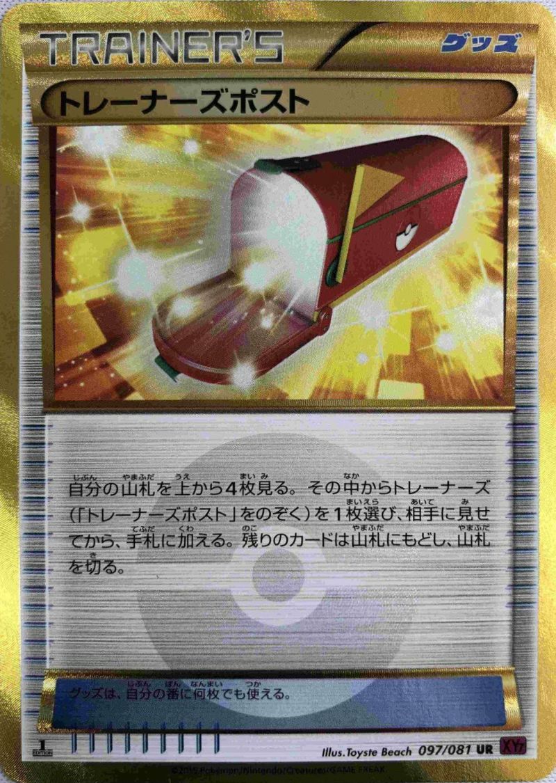 トレーナーズポスト(097/081)は、拡張パック「バンデットリング」に収録されたグッズカードのウルトラレア(UR)版です。効果は、自分の山札の上から4枚を見て、その中からトレーナーズ(「トレーナーズポスト」を除く)を1枚選び、相手に見せて手札に加え、残りのカードを山札に戻してシャッフルするというものです。これにより、必要なトレーナーズカードを素早く手札に加えることが可能です。イラストはToyste Beach氏が手掛けています。