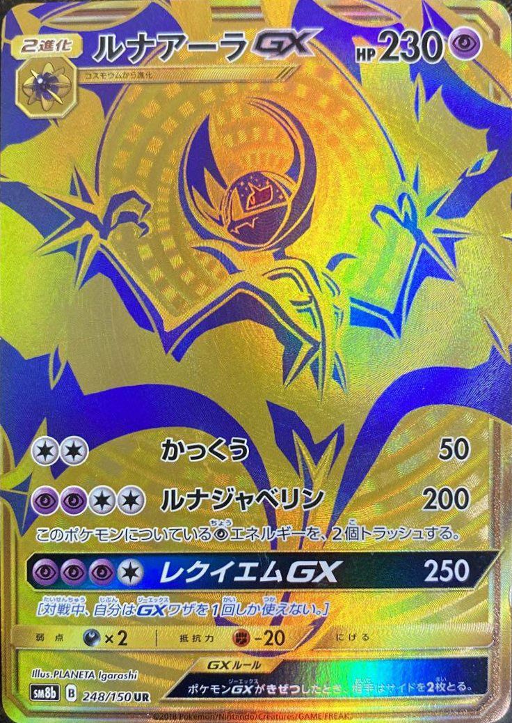 ルナアーラGX(248/150)は、ハイクラスパック「GXウルトラシャイニー」に収録された超タイプの2進化ポケモンGXで、ウルトラレア(UR)仕様のカードです。特性「サイコトランス」により、自分の番に何度でも自分の場のポケモンについている超エネルギーを別のポケモンに付け替えることができます。ワザ「シャドーレイ」は、超エネルギー4個で120ダメージを与え、次の相手の番、このワザを受けたポケモンのHP回復を封じます。GXワザ「ルナフォールGX」は、超エネルギー3個で相手のたねポケモン(ポケモンGXを除く)を1匹きぜつさせる強力な効果を持ちます。弱点は悪タイプ(×2)、抵抗力は闘タイプ(-20)、逃げるためのエネルギーは2個です。デッキでは、特性を活かしたエネルギー管理と高火力のワザで相手を制圧する戦術が可能です。また、GXワザで相手の重要なたねポケモンを直接きぜつさせることで、戦況を有利に進めることができます。UR版のイラストは、ルナアーラの神秘的な魅力を引き立てるデザインが特徴です。