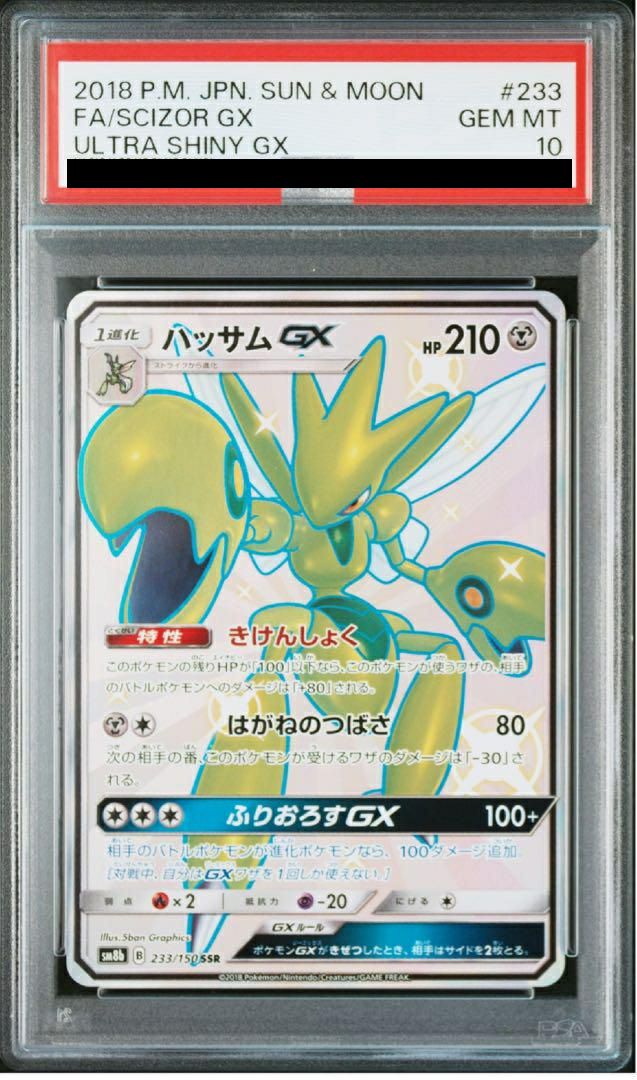 ハッサムGX(233/150)は、鋼タイプの1進化ポケモンGXで、HPは210です。特性「きけんしょく」により、残りHPが100以下のとき、ワザのダメージが80増加します。ワザ「はがねのつばさ」は鋼エネルギー1つと無色エネルギー1つで80ダメージを与え、次の相手の番、このポケモンが受けるワザのダメージを30減らします。GXワザ「ふりおろすGX」は無色エネルギー3つで100ダメージを与え、相手のバトルポケモンが進化ポケモンなら、追加で100ダメージを与えます。弱点は炎タイプ(×2)、抵抗力は超タイプ(-20)、逃げるためのエネルギーは1つです。デッキでは、特性を活かして高火力を狙えるアタッカーとして活躍します。SSR(シークレットスーパーレア)版は、色違いの特別なイラストが施され、コレクション性が高いです。