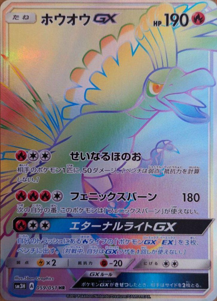 ホウオウGX(059/051)は、炎タイプのたねポケモンで、HP190を持ちます。ワザ「せいなるほのお」は、炎エネルギー1個と無色エネルギー2個で、相手のポケモン1匹に50ダメージを与えます(ベンチポケモンにも攻撃可能で、弱点・抵抗力を計算しません)。「フェニックスバーン」は、炎エネルギー3個と無色エネルギー1個で180ダメージを与えますが、次の自分の番、このポケモンは「フェニックスバーン」を使えなくなります。GXワザ「エターナルライトGX」は、炎エネルギー1個と無色エネルギー2個で、自分のトラッシュにある炎タイプのポケモンGX・EXを3枚までベンチに出すことができます。これらのワザにより、相手のポケモンに大きなダメージを与えつつ、トラッシュから強力なポケモンを復活させることが可能です。ただし、ポケモンGXがきぜつした際、相手はサイドを2枚取る点に注意が必要です。ハイパーレア(HR)版のイラストは、虹色の光沢加工が施され、ホウオウの神秘的な魅力を引き立てています。