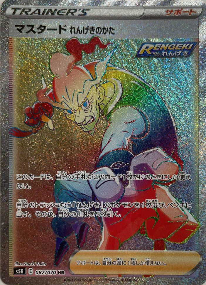 マスタード れんげきのかた(087/070)は、サポートカードで、手札がこのカード1枚のみのときに使用可能です。トラッシュから「れんげき」のポケモンを1枚選び、ベンチに出した後、山札を5枚引きます。「れんげき」デッキの展開を加速させる強力なサポートです。HR(ハイパーレア)版は、特別なホログラフィック加工が施された豪華なデザインが特徴です。