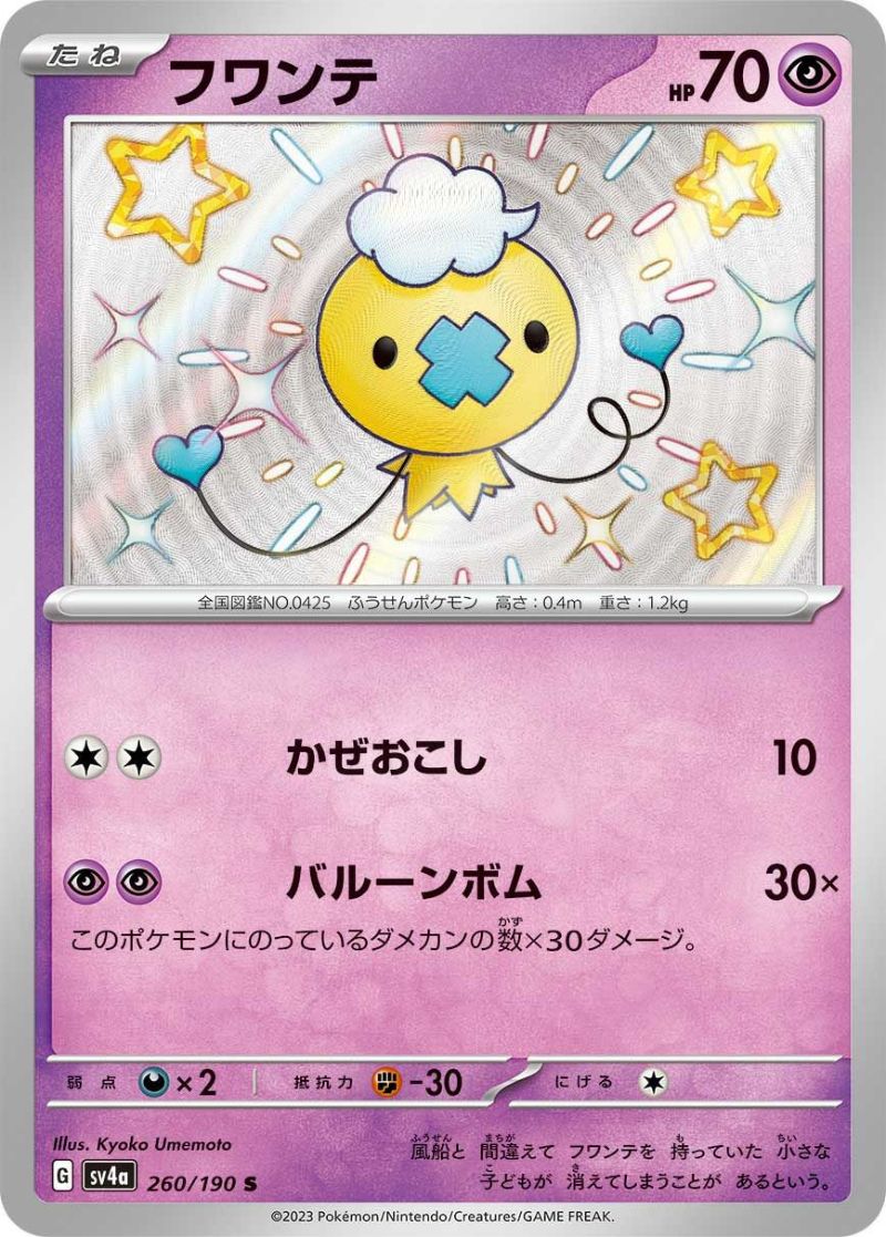 フワンテ(260/190)は、ハイクラスパック「シャイニートレジャーex」に収録された超タイプのたねポケモンで、HPは70です。ワザ「かぜおこし」は無色エネルギー1つで10ダメージを与え、「バルーンボム」は無色エネルギー2つで、このポケモンにのっているダメカンの数×30ダメージを与えます。弱点は悪タイプ、抵抗力は闘タイプ(-30)、逃げるためのコストは1です。このカードは、ダメカンの数に応じてダメージを増加させる戦略に適しています。また、色違いのフワンテが描かれたスペシャルアート仕様で、コレクターからも注目されています。