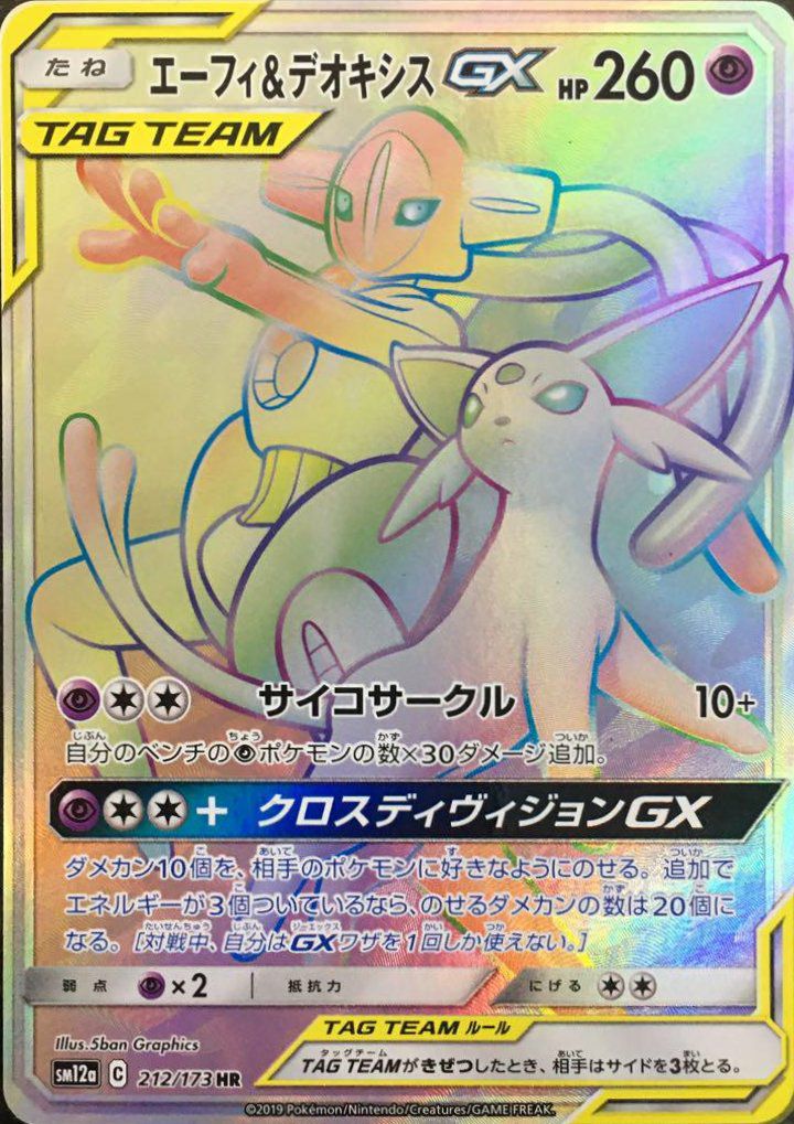エーフィ&デオキシスGX(212/173)は、超タイプのTAG TEAM GXポケモンで、HP260を持ちます。ワザ「サイコサークル」は、超エネルギー1個と無色エネルギー2個で10ダメージを与え、自分のベンチの超ポケモンの数×30ダメージを追加します。GXワザ「クロスディヴィジョンGX」は、ダメカン10個を相手のポケモンに好きなようにのせる効果を持ち、追加でエネルギーが3個ついているなら、のせるダメカンの数は20個になります。これらのワザにより、ベンチを展開しつつ高火力を狙う戦略や、相手の場全体に柔軟にダメージを与える戦術が可能です。HR(ハイパーレア)版のイラストは、エーフィとデオキシスが共闘する姿が描かれており、特別なデザインが施されています。このカードは、ハイクラスパック「TAG TEAM GX タッグオールスターズ」に収録されています。