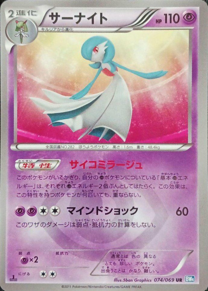 サーナイト(074/069)は、拡張パック「ダークラッシュ」に収録されたウルトラレア(UR)の超タイプ2進化ポケモンで、HPは110です。特性「サイコミラージュ」により、自分の超ポケモンに付いている基本超エネルギー1個が、超エネルギー2個分として働きます(この効果は重複しません)。ワザ「マインドショック」は、超エネルギー2個と無色エネルギー2個で60ダメージを与え、弱点・抵抗力を計算しません。この特性により、超タイプデッキのエネルギー効率を高め、強力な攻撃をサポートします。イラストは5ban Graphics氏が担当しています。