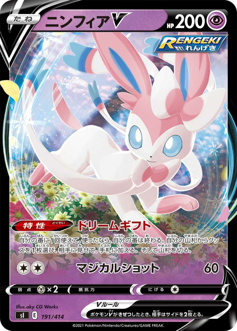 ニンフィアV(191/414)は、スタートデッキ100に収録された超タイプのたねポケモンVで、レアリティはダブルレア(RR)です。HPは200で、特性「ドリームギフト」は、自分の番に1回使え、使用後は自分の番が終わりますが、山札からグッズを1枚選び、手札に加えることができます。技「マジカルショット」は無色エネルギー2個で60ダメージを与えます。このカードは、特性を活かして必要なグッズを手札に加えることで、デッキの安定性を高める役割を持ちます。進化先のニンフィアVMAXと組み合わせることで、さらなる戦略の幅が広がります。