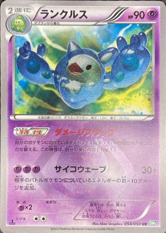 ランクルス(054/050)は、超タイプの2進化ポケモンで、HPは90です。特性「ダメージスワップ」は、自分のポケモンにのっているダメカンを1個選び、別の自分のポケモンにのせ替えることができ、この特性は自分の番に何回でも使用可能です。ワザ「サイコウェーブ」は、超エネルギー3個で30ダメージを与え、さらに相手のバトルポケモンについているエネルギーの数×10ダメージを追加します。弱点は超タイプ(×2)、抵抗力はなく、逃げるためのエネルギーは2個です。デッキでは、特性を活かしてダメカンの調整を行い、耐久力を高める戦術に適しています。ウルトラレア(UR)版のイラストは、通常とは色の異なる非常に珍しいデザインが特徴で、出会うことが非常に難しいとされています。