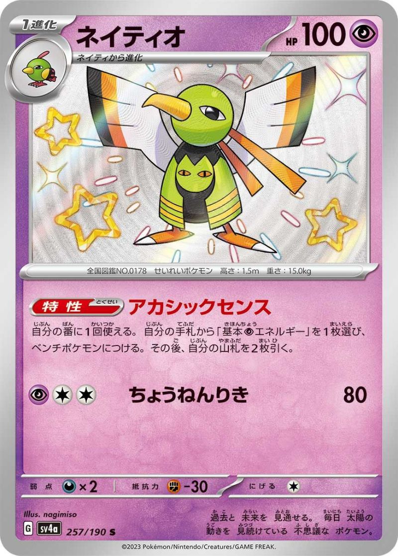 ネイティオ(257/190)は、ハイクラスパック「シャイニートレジャーex」に収録された超タイプの1進化ポケモンで、レアリティはS(シャイニー)です。HPは100で、特性「アカシックセンス」は、自分の番に1回、手札から基本エネルギーを1枚ベンチポケモンに付け、その後山札を2枚引くことができます。ワザ「ちょうねんりき」は超エネルギー1個と無色エネルギー2個で80ダメージを与えます。弱点は悪タイプ(×2)、抵抗力は闘タイプ(-30)、逃げるためのエネルギーは1個です。このカードは、特性を活かしてエネルギー加速とドローを同時に行えるため、デッキの展開力を高める役割を持ちます。