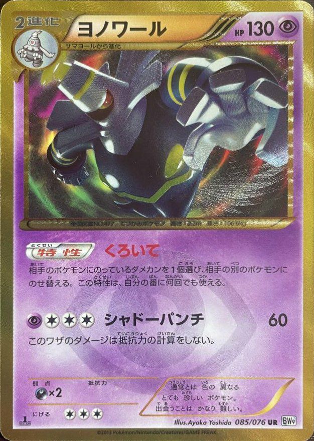 ヨノワール(085/076)は、拡張パック「メガロキャノン」に収録された超タイプの2進化ポケモンで、HPは130です。特性「くろいて」は、相手のポケモンにのっているダメカンを1個選び、別のポケモンにのせ替えることができ、この特性は自分の番に何回でも使用可能です。ワザ「シャドーパンチ」は、超エネルギー1個と無色エネルギー3個で60ダメージを与え、このダメージは抵抗力の計算を行いません。特性により、相手の場のダメカンを自在に操作し、効率的にポケモンをきぜつさせる戦略が可能です。ウルトラレア(UR)版は、豪華なホイル加工が施され、コレクション性が高いカードです。