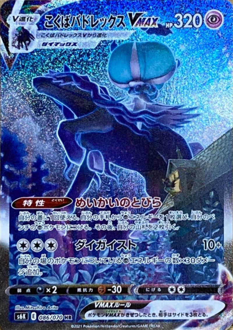 こくばバドレックスVMAX(086/070)は、超タイプのVMAXポケモンで、HPは320です。特性「めいかいのとびら」は、自分の番に1回、手札から超エネルギーを1枚ベンチポケモンにつけ、その後山札を2枚引くことができます。ワザ「ダイガイスト」は、基本ダメージ10に加え、自分の場のポケモンについている超エネルギーの数×30の追加ダメージを与えます。デッキでは、特性によるエネルギー加速とドロー効果を活かし、高火力を狙う戦術に適しています。スペシャルアート(SA)仕様のこのカードは、こくばバドレックスが夜の森を駆け抜ける幻想的なイラストが特徴で、コレクション性が高いです。