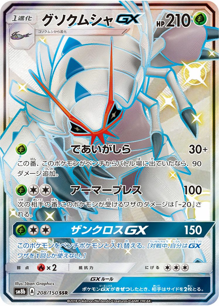 グソクムシャGX(208/150)は、ハイクラスパック「GXウルトラシャイニー」に収録されたスペシャルアート仕様の草タイプ1進化ポケモンで、HPは210です。「であいがしら」は、この番にベンチからバトル場に出ていた場合、120ダメージを与える強力なワザです。「アーマープレス」は100ダメージを与え、次の相手の番に受けるワザのダメージを20軽減します。GXワザの「ザンクロスGX」は150ダメージを与え、このポケモンをベンチポケモンと入れ替える効果を持ち、戦況に応じた柔軟な立ち回りが可能です。SSR版のイラストは、通常版とは異なる特別なデザインが施され、コレクターから高い評価を受けています。