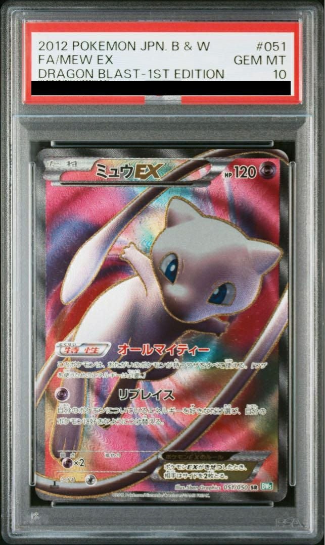 ミュウEX(051/050)[SR]は、拡張パック「リューズブラスト」に収録された超タイプのたねポケモンEXです。特性「オールマイティー」により、このポケモンはお互いのポケモンが持つワザをすべて使用できます。ワザ「リプレイス」は、無色エネルギー1個で自分のポケモンについているエネルギーを好きなだけ選び、他のポケモンに自由につけ替えることができます。デッキでは、特性を活かして多彩なワザを繰り出し、ワザでエネルギーの再配置を行うことで柔軟な戦術を展開できます。SR(スーパーレア)版のイラストは、ミュウが異次元のような空間からこちらを見つめるミステリアスなデザインとなっています。