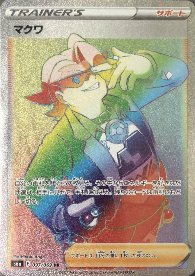 マクワ(097/069)は、サポートカードで、山札の上から7枚を確認し、その中からエネルギーを好きなだけ選び、手札に加えることができます。デッキのエネルギー供給を安定させるのに役立ちます。HR(ハイパーレア)版は、特別なホログラフィック加工が施された豪華なデザインが特徴です。