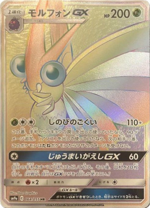 モルフォンGX(064/055)[HR]は、拡張パック「ナイトユニゾン」に収録された草タイプの1進化ポケモンで、特定のサポートカードと組み合わせることで高いダメージや防御効果を発揮します。HR(ハイパーレア)仕様のため、特別なホログラフィック加工が施され、コレクション価値も高い一枚です。