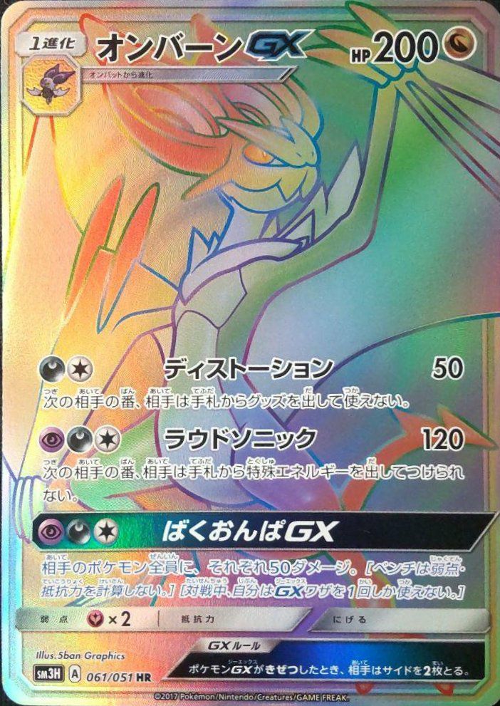 オンバーンGX(061/051)は、拡張パック「闘う虹を見たか」に収録されたドラゴンタイプの1進化ポケモンGXで、HPは200です。ワザ「ディストーション」は、悪エネルギー1つと無色エネルギー1つで50ダメージを与え、次の相手の番、相手は手札からグッズを出して使えなくなります。「ラウドソニック」は、超エネルギー1つ、悪エネルギー1つ、無色エネルギー1つで120ダメージを与え、次の相手の番、相手は手札から特殊エネルギーをつけられなくなります。GXワザ「ばくおんぱGX」は、超エネルギー1つ、悪エネルギー1つ、無色エネルギー1つで、相手のポケモン全員にそれぞれ50ダメージを与えます(ベンチポケモンには弱点・抵抗力を計算しません)。デッキでは、相手の戦略を制限しつつ、広範囲にダメージを与える戦術で活躍します。HR(ハイパーレア)版のカードは、虹色のホログラフィック加工が施され、美麗なデザインが特徴です。