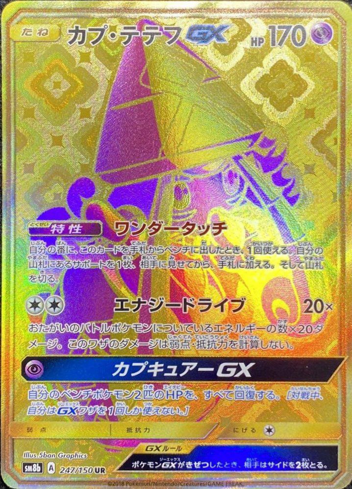 カプ・テテフGX(247/150)は、超タイプのたねポケモンで、HP170を持ちます。特性「ワンダータッチ」は、このカードを手札からベンチに出したときに1回使え、山札からサポートカードを1枚選んで手札に加えることができます。ワザ「エナジードライブ」は、超エネルギー1個と無色エネルギー1個で、お互いのバトルポケモンについているエネルギーの数×20ダメージを与えます(このダメージは弱点・抵抗力を計算しません)。GXワザ「カプキュアーGX」は、超エネルギー1個で自分のベンチポケモン2匹のHPをすべて回復します。デッキでは、特性によるサポートカードのサーチ能力と、汎用性の高いワザを活かし、さまざまな戦術で活躍が期待できます。ウルトラレア(UR)仕様のカードは、金色の光沢が特徴的で、コレクション性が高いです。