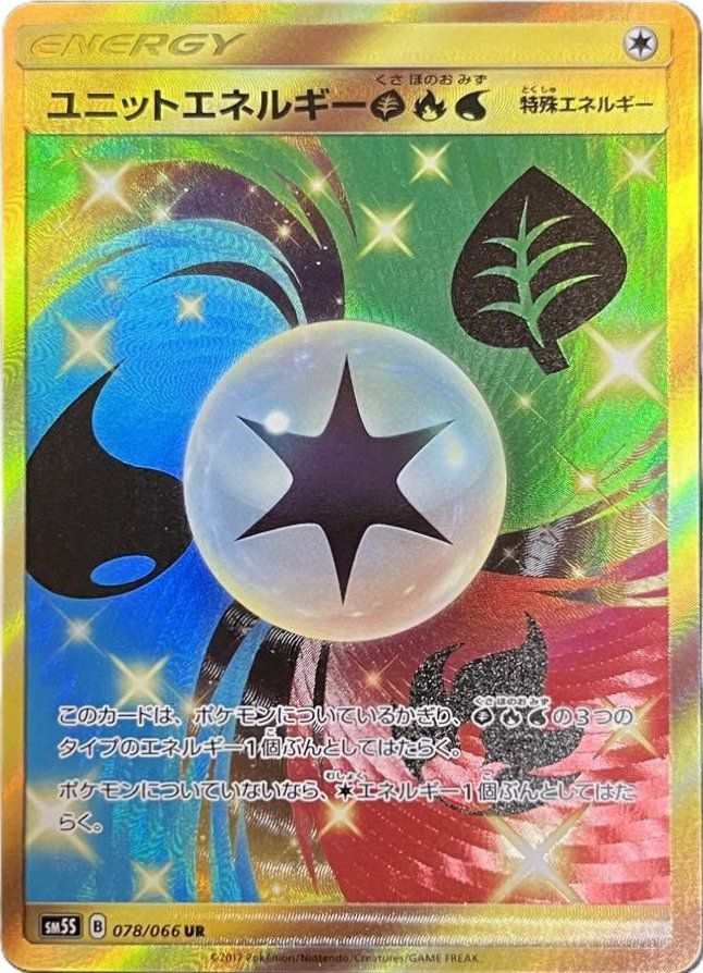 ユニットエネルギー草炎水(078/066)は、拡張パック「ウルトラサン」に収録されたウルトラレア(UR)の特殊エネルギーカードです。このカードは、ポケモンに付けている限り、草、炎、水の3タイプのエネルギー1個分として機能します。ポケモンに付いていない場合は、無色エネルギー1個分として働きます。複数のタイプのエネルギーを必要とするデッキで、柔軟なエネルギー供給をサポートします。UR版は、豪華なイラストと光沢が特徴で、コレクション性も高いカードです。
