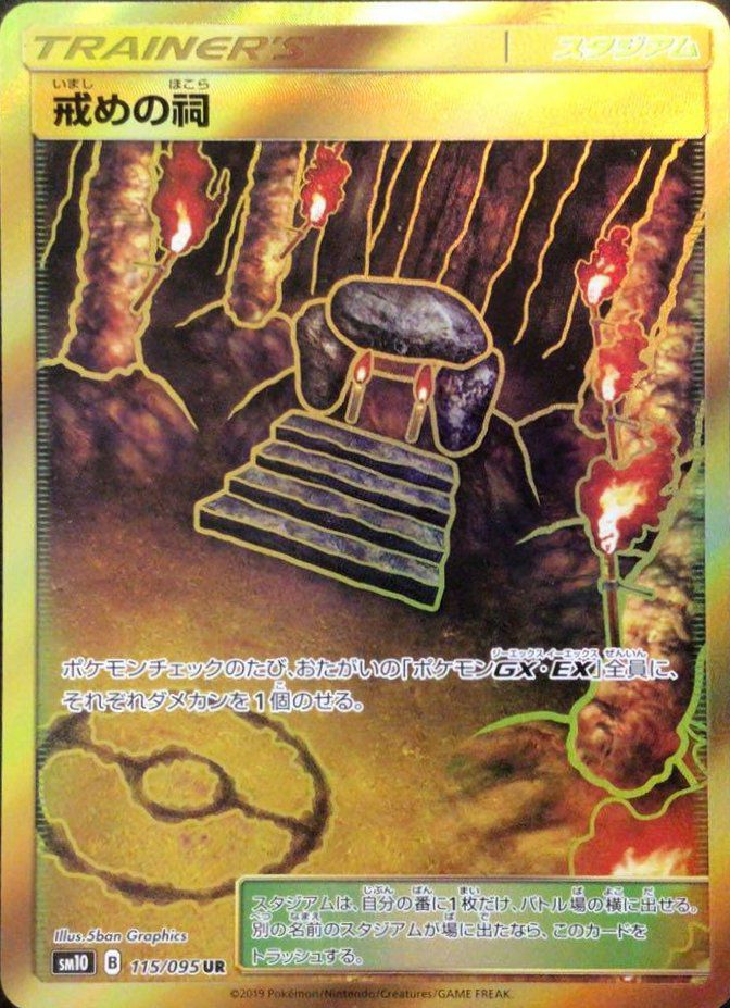 戒めの祠(115/095)[UR]は、拡張パック「ダブルブレイズ」に収録されたスタジアムカードです。このカードが場に出ている間、ポケモンチェックのたびに、お互いの「ポケモンGX・EX」全員に、それぞれダメカンを1個のせる効果を持ちます。これにより、相手の強力なポケモンGX・EXに継続的なダメージを与え、戦況を有利に進めることが可能です。UR(ウルトラレア)仕様のカードは、豪華なホイル加工が施され、コレクターから高い人気を集めています。デッキ構築においては、相手のポケモンGX・EXを牽制する戦略として活用されます。