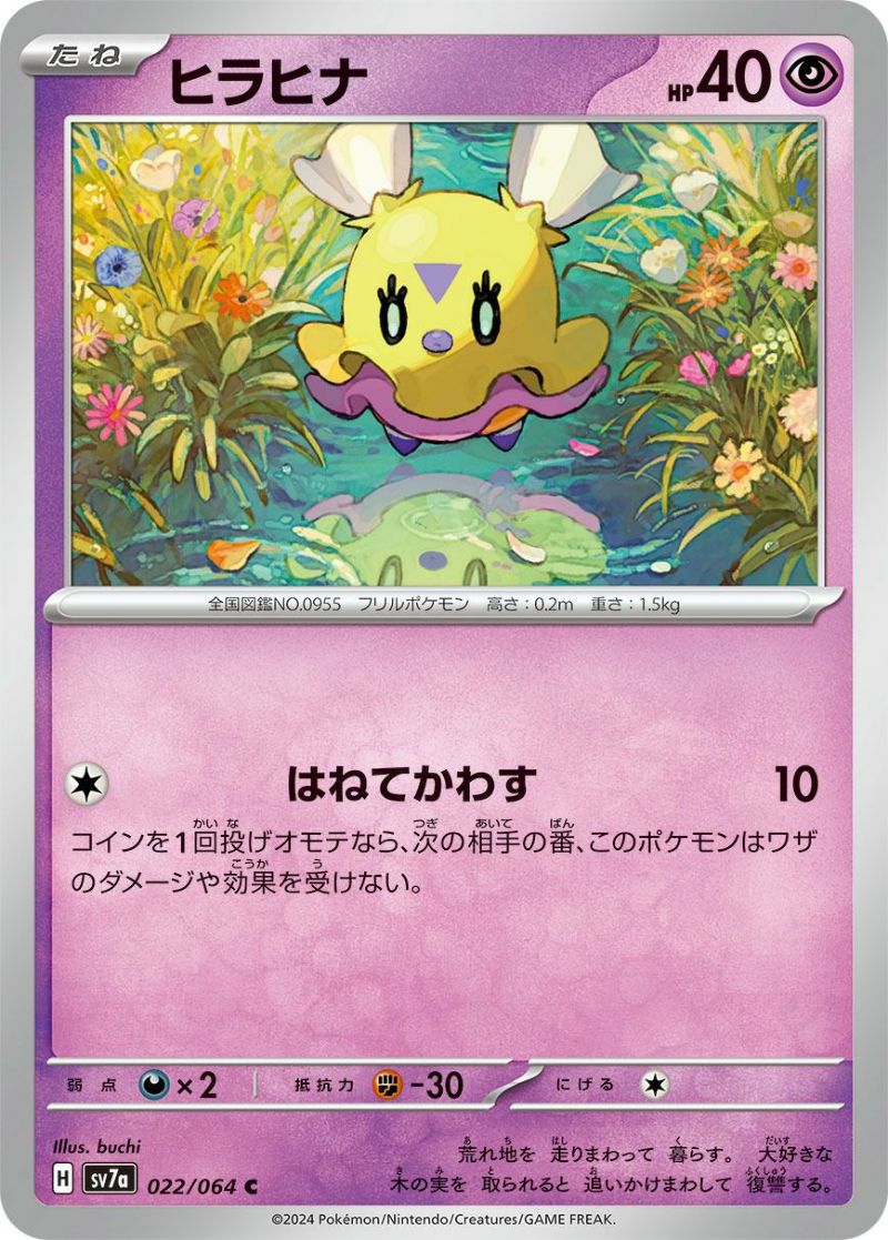 ヒラヒナ(022/064)[C]は、超タイプのたねポケモンで、HP40を持ちます。技「はねてかわす」は無色エネルギー1個で10ダメージを与え、コインを1回投げてオモテが出れば、次の相手の番、このポケモンはワザのダメージや効果を受けません。この効果により、相手の攻撃を回避する可能性があり、バトルの展開を有利に進めることができます。デッキ構築では、進化先のクエスパトラやクエスパトラexへのスムーズな進化を目指し、序盤からの安定した展開をサポートします。このカードは、強化拡張パック「楽園ドラゴーナ」に収録されています。